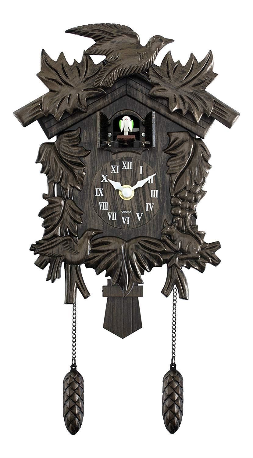 Cuckoo Clock with Weights and Pendulum, Hourly Cuckoo Sound 'Hamburg' 27828The Acctim ‘Hamburg’ is a beautiful antique finish traditional styled cuckoo clock. The hourly cuckoo chime has automatic night shut-off so the little cuckoo in the top will snooze all night. The detailed surround is topped with a traditional bird. The ornate Roman Numeral face of the clock adds a nice finishing touch. A stunning focal point in your home. Comes boxed with instructions leaflet.