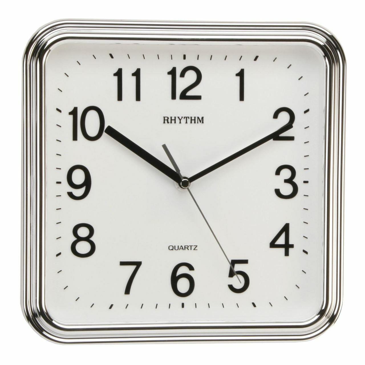 A stunning silver cased square wall clock featuring Rhythm's signature silent silky sweep movement. The clock features an ultra-precise quartz movement that will keep perfect time for a lifetime. It also features a white face, 3D black Arabic numerals, straight black hands and a silver sweeping second hand. Requires 1...
