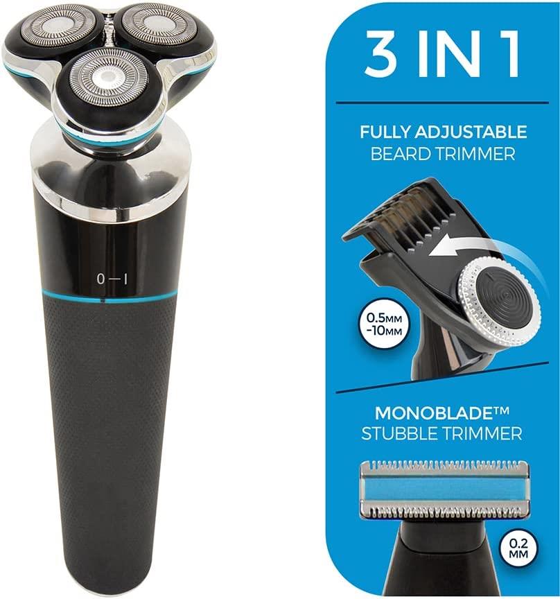 LITHIUM POWER - The High power, ultra-fast charging lithium-ion battery is ready to use in less than 5 minutes. It is fully charged in around 2 hours, which will provide an extra long 90 minute operation. That is around 30 full shaves. Use any USB 5v DC power source, but 2100mAh recommended. WET OR DRY USE - With the advanced IPX5 waterproof system, you can open the shaver head to rinse with water for easy cleaning after use, or you can use the shave with shaving foam/gel creams. 3D FLOATING HEADS - The 3 dual track rotary blades has one blade lifting the hair follicle, while the second blade cuts it flush to the skin for the smoothest shave ever. The 3D multi-directional heads flex and follow the contours and curvature of the face for a smooth and precise shave. ERGONOMIC - The full textured rubber grip is designed for maximum comfort with a twist ON/OFF control and modern shaver stand. STUBBLE TIMMER - The additional interchangeable MonoBlade stubble trimming head with its 10 layers skin protection provide a very close shave to 0.2mm for that close stubble feel, or the double-sided head can be used to add detail to any beard, moustache or sideburns. BEARD TRIMMER - The adjustable beard trimmer attachment easily clips to the Monoblade head providing 20 different lengths of beard from 0.5mm to 10mm. Combining the shaver with the additional attachments will give unsurpassed performance and the perfect look you need from day to day.
