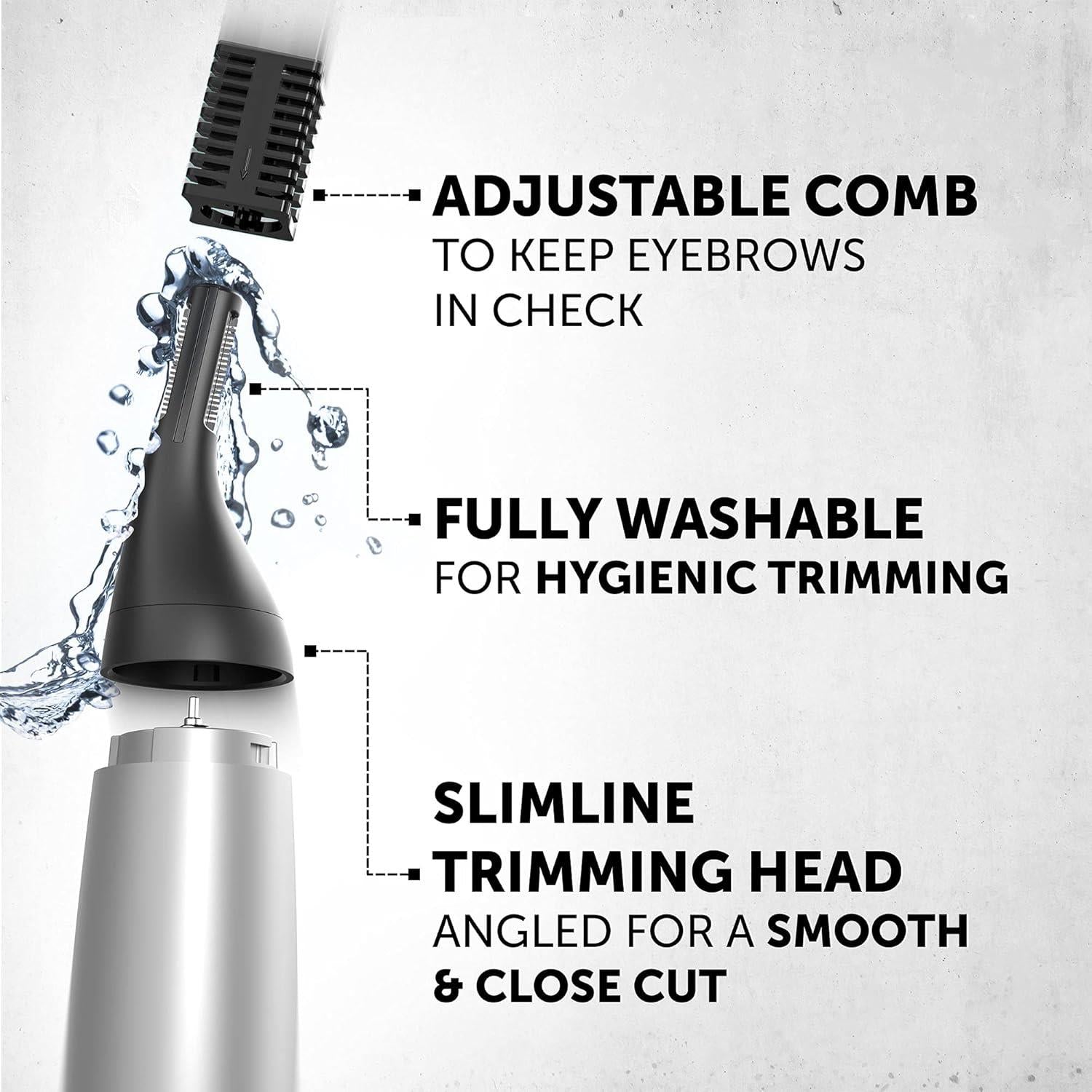 FULLY WASHABLE - The precision ear, nose & eyebrow trimmer is fully washable ensuring hygienic use and provides ultimate power and precision for pain-free personal trimming VERTICLE TRIMMING HEAD -The vertical trimming head provides aclose cut of 1mm and offers the perfect angle for a smooth, close cut without irritation or pulling EYEBROW ATTACHMENT COMB - With a unique eyebrow attachment comb which offers an additional 4 trimming lengths for precise eyebrow trimming offering lengths between 2mm - 5mm COMPACT - Perfect for use in the bathroom and compact enough for travel use