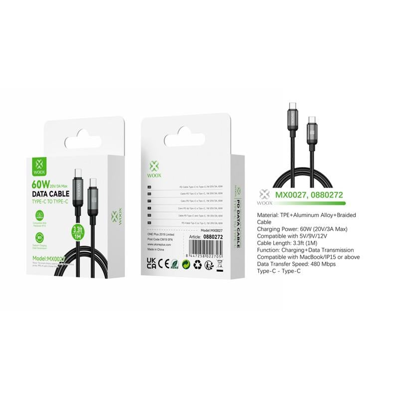 Woox MX0027 Type C to Type C Braided Data Cable, 60W, 3.3ft 1m, Black