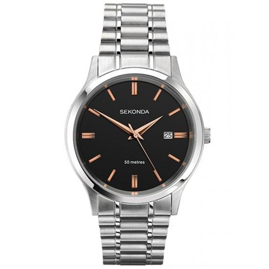 This analogue display watch from Sekonda features a black dial with date function and contrasting rose gold tone hands and hour markers. It is completed with a stainless steel bracelet and fold over clasp.