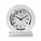 A round glass mantel clock from WILLIAM WIDDOP?. This mantel clock has a beautiful contemporary design with a glass surround. The main clock face features a silver bezel and a roman numeral dial. Whether it?s a gift for a housewarming or a birthday, this mantel clock has a lasting style...